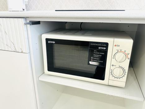 В гостиной новый раскладной диван, на кухне новый холодильник, микроволновая печь, плита с духовкой, электрический чайник.