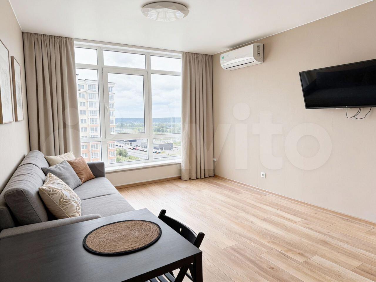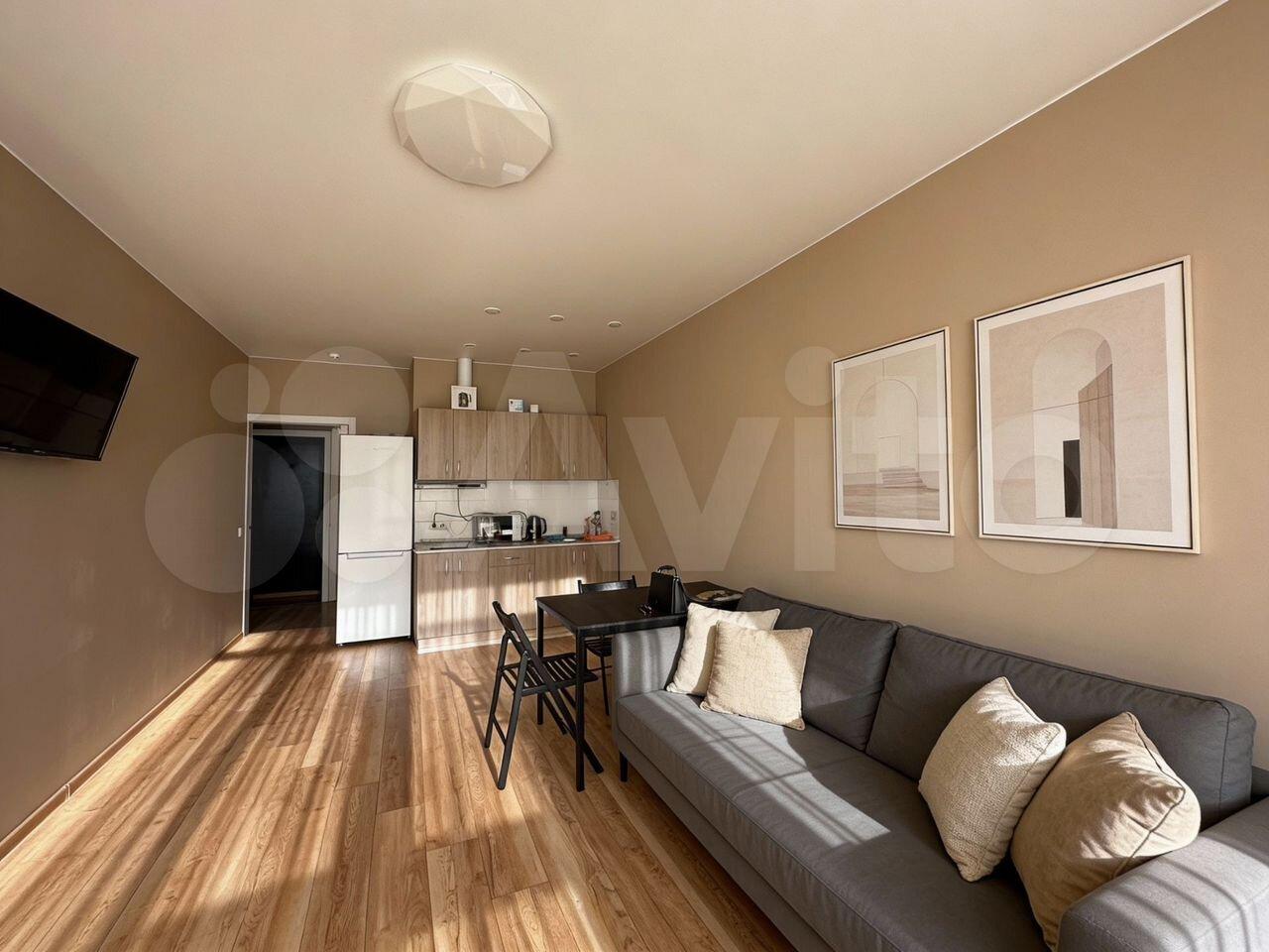 В квартире изолированные комнаты, что обеспечивает комфорт и приватность. Просторная кухня площадью 10 м² оснащена необходимой бытовой техникой, включая холодильник и плиту. В гостиной установлен телевизор и удобный кожаный диван.