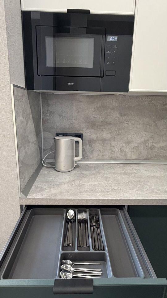 Кухня оснащена современной техникой, включая холодильник и микроволновую печь. Также имеется обеденный стол и стулья. Ванная комната совмещенная, с качественной сантехникой и стильным оформлением.