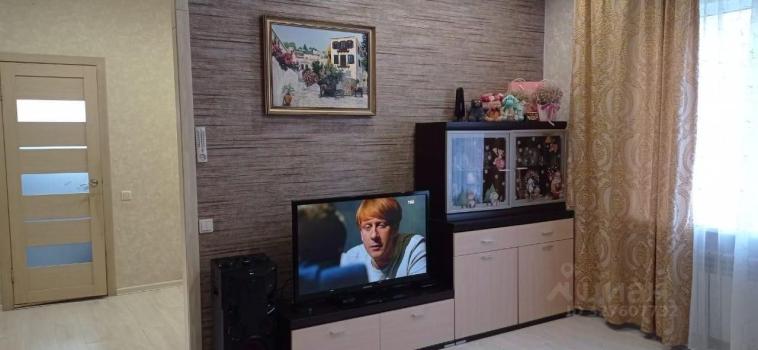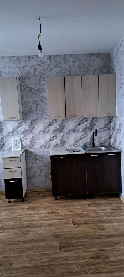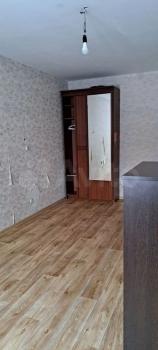 Однокомнатная с окнам на две стороны дома (большой коридор, из него в две стороны кухня и комната), без лишней хозяйской мебели. На кухне - печь, холодильник, стол, шкаф для посуды и шкаф с раковиной. В коридоре - встроенный шкаф.