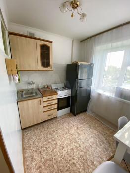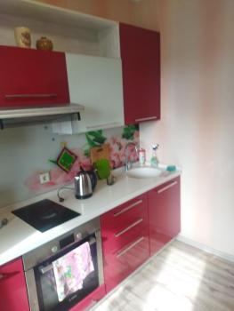 Однокомнатная с окнам на две стороны дома (большой коридор, из него в две стороны кухня и комната), без лишней хозяйской мебели. На кухне - печь, холодильник, стол, шкаф для посуды и шкаф с раковиной. В коридоре - встроенный шкаф.