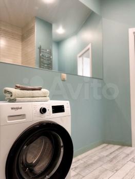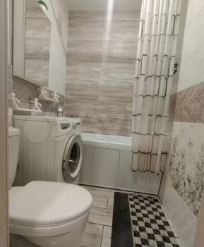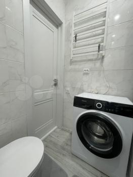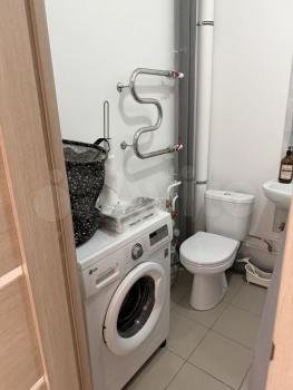 Санузел совмещенный, оформлен в светлых тонах, оснащен ванной и стиральной машиной. В прихожей имеется гардеробная для удобного хранения вещей.