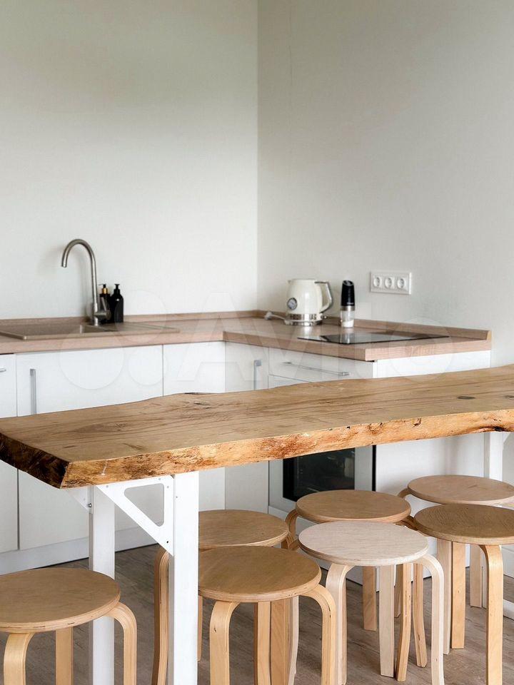 Кухня оборудована: холодильником, двухкомфорочной плитой, микроволновкой, чайником, обеденной зоной с кухонным столом, 2 удобных кухонных стула (вся мебель и техника абсолютно новые, чистые).