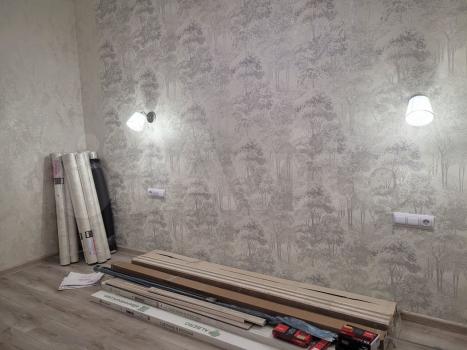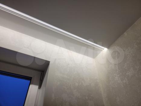 Квартира светлая, теплая. Висят люстры, установлен аллюм.профиль- карниз для штор с подсветкой. Современная планировка гостиная – студия с выделенной кухонной зоной + изолированная спальня с выделенным местом под шкаф + ванная комната + прихожая.