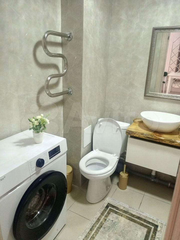 Санузел совмещённый, оборудован современной душевой кабиной и стиральной машиной. В подъезде есть пассажирский и грузовой лифты.