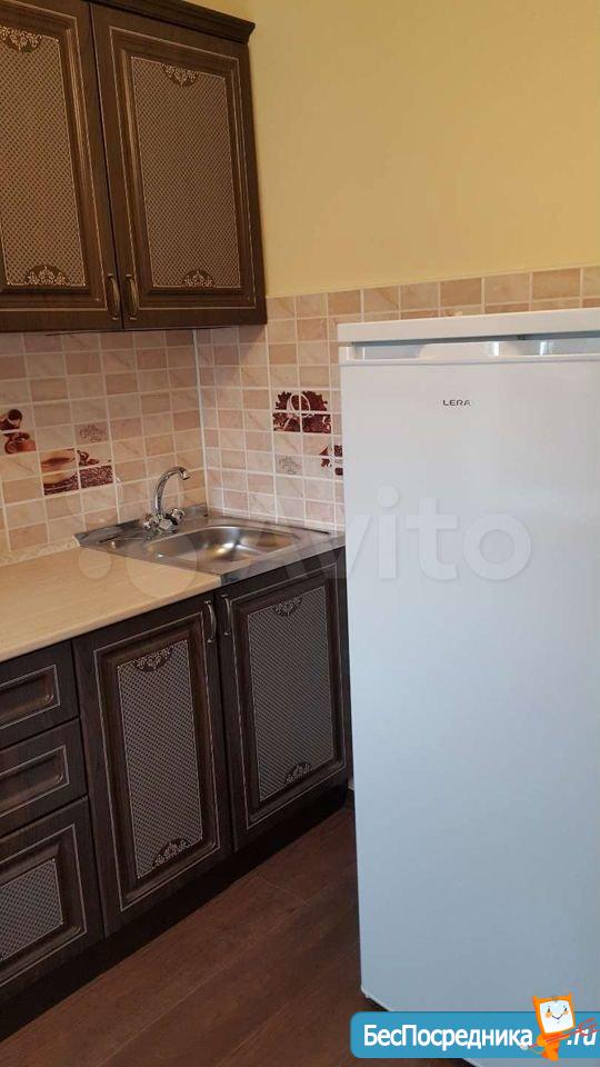 Кухня компактная, площадью 6 м², оснащена необходимой техникой, включая холодильник и микроволновую печь. Санузел совмещённый.