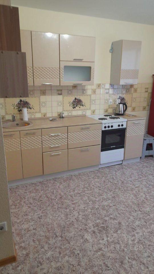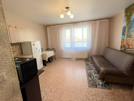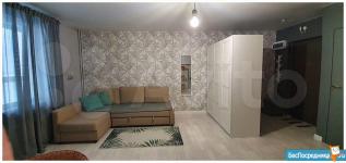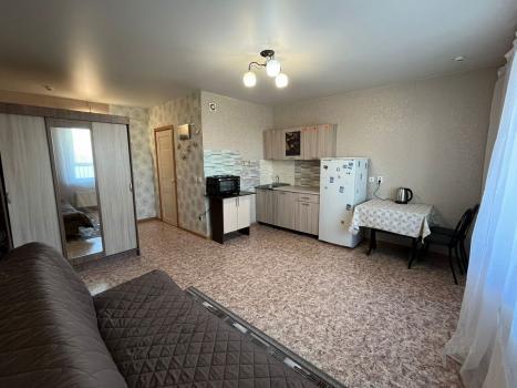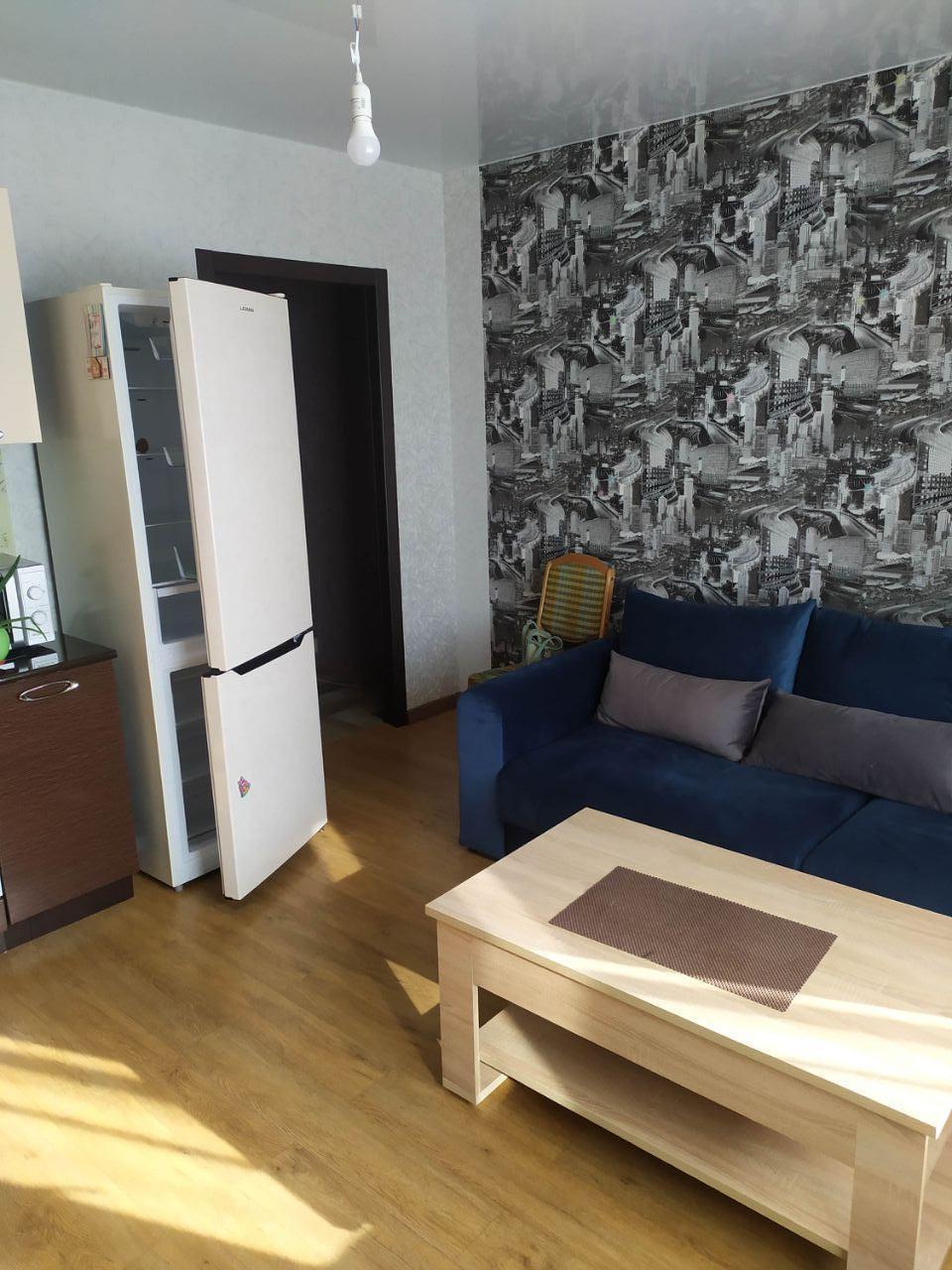 Уютная студия. Рядом детский сад, школа, магазины. Есть холодильник, диван, кухонный гарнитур и шкаф.