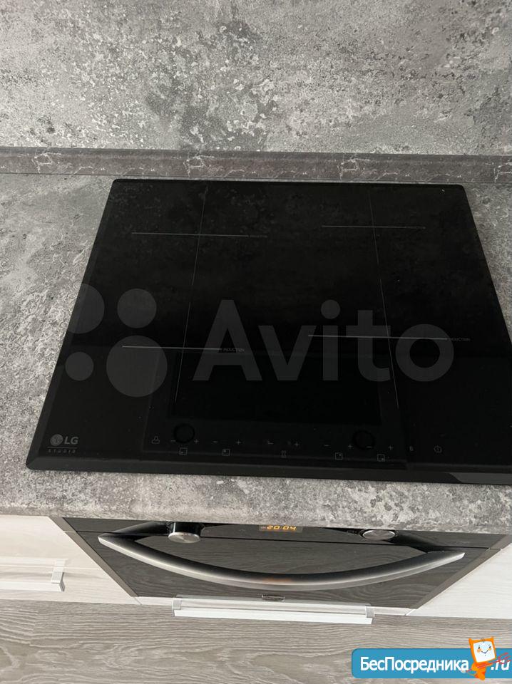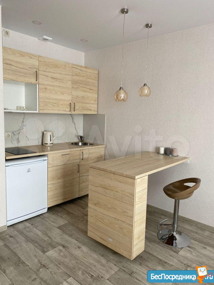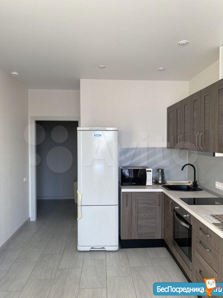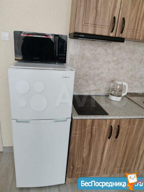 холодильник, керамическая плита, чайник, микроволновая печь, стол, стулья...