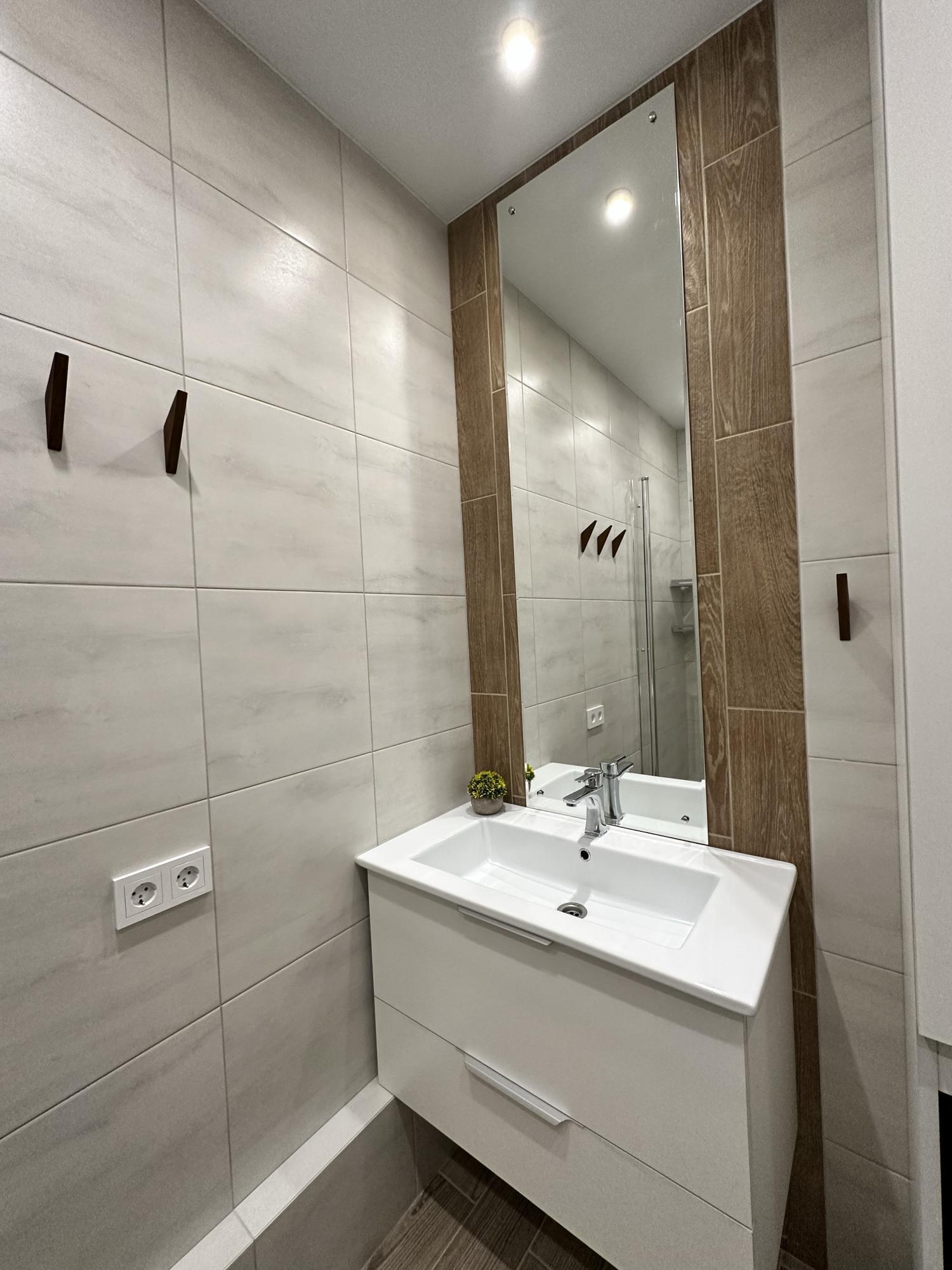 В квартире имеется всё необходимое для проживания: 2 кондиционера, бойлер, холодильник, варочная панель, духовой шкаф, чайник, стиральная машина, телевизор, микроволновая печь, частично есть посуда и столовые приборы. Есть гардероб и необходимая мебель. Зимой и летом в квартире тепло, а из окна открывается красочный вид.