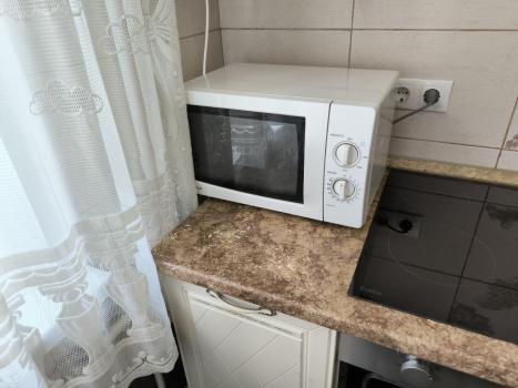 Квартира меблирована и оснащена необходимой техникой: кухонный гарнитур с встроенной бытовой техникой (духовой шкаф, варочная поверхность, вытяжка, холодильник, микроволновая печь, стиральная машинка, шкаф в зале и коридоре, диван, двуспальная кровать (на 140 см), обеденный стол. Есть кондиционер и водонагреватель.
