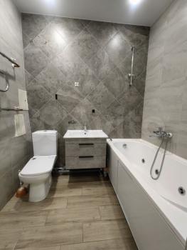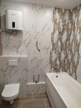 ? В ванной установлена качественная сантехника (GRОНЕ), унитаз, подвесная тумба, акриловая ванна, вентилятор в вентшахте для дополнительного проветривания.