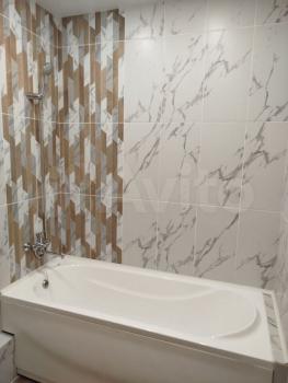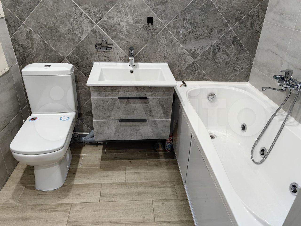 В ванной установлена качественная сантехника: унитаз, подвесная тумба, акриловая ванна, вентилятор в вентшахте для дополнительного проветривания.