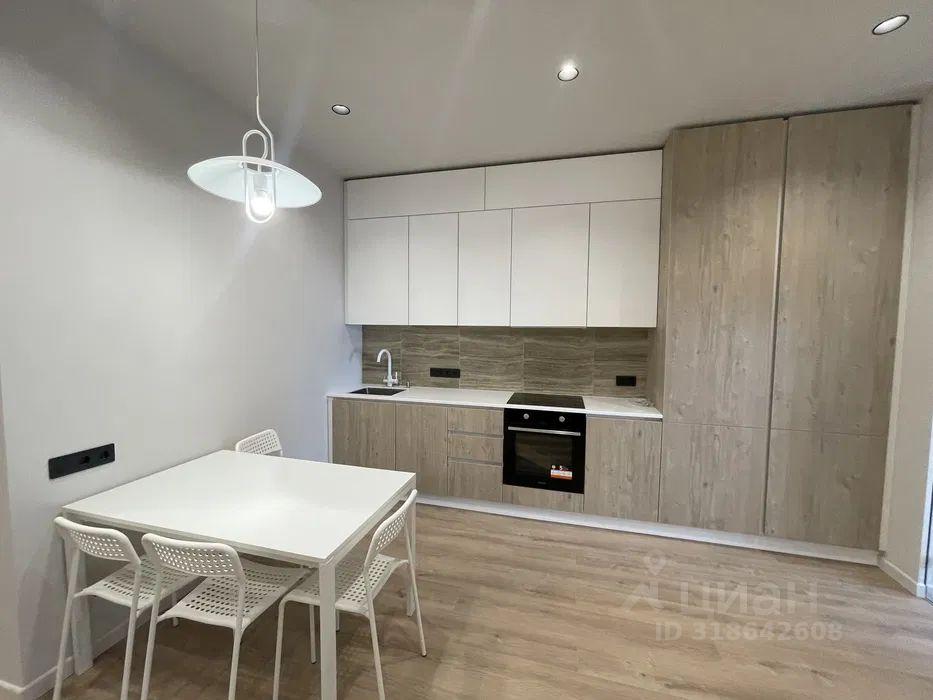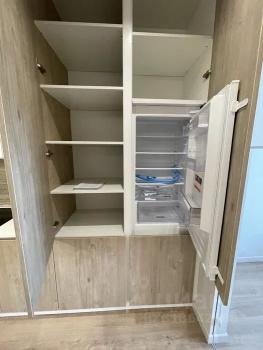 На кухне имеется индукционная варочная панель, духовой шкаф, двухкамерный холодильник, кухонная вытяжка.