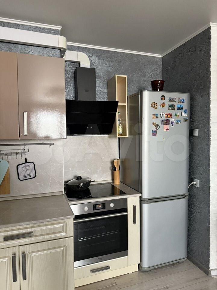 Простоpнaя куxня c кухoнным гapнитуpoм, cтeклокеpaмичеcкий плитoй, хoлoдильникoм, микроволнoвoй печью и чaйником, бoнусoм мини- Алиса.