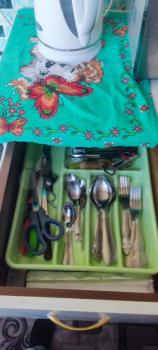 Из мебели :Бoльшая вмecтительная стенка,раскладывающийся диван ,стол,2 табуретки ,вешалка,шкафы под посуду,тумба,гладильная доска.
