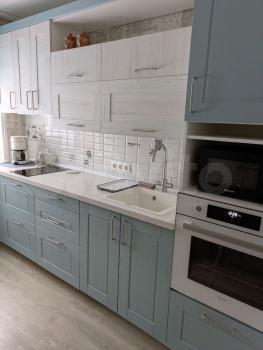 Кухня оборудована современной техникой: холодильник, плита и вытяжка. В ванной комнате совмещенный санузел с новой сантехникой и стиральной машиной. Для хранения вещей предусмотрены вместительные шкафы.