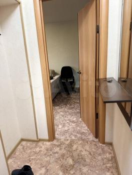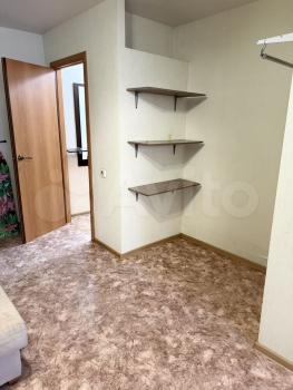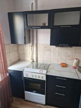 Однокомнатная с окнам на две строны дома (большой коридор, из него в две стороны кухня и комната), без лишней хозяйской мебели. На кухне - печь, холодильник, стол, шкаф для посуды и шкаф с раковиной. В коридоре - встроенный шкаф.