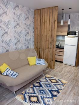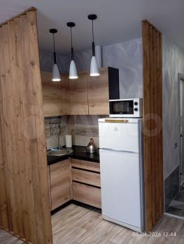 Кухня оснащена необходимой бытовой техникой, включая холодильник и микроволновую печь. В гостиной зоне находится диван и телевизор. Санузел раздельный, что добавляет удобства.