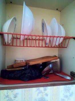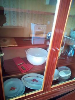 В квартире есть плита электрическая. Посуда, холодильник, микроволновка, стол и стулья кухонные, стиральная машина, пылесос, телевизор, кровать полуторка и один комплект белья с подушками, проигрыватель, шкаф для белья и одежды, душевая кабина.