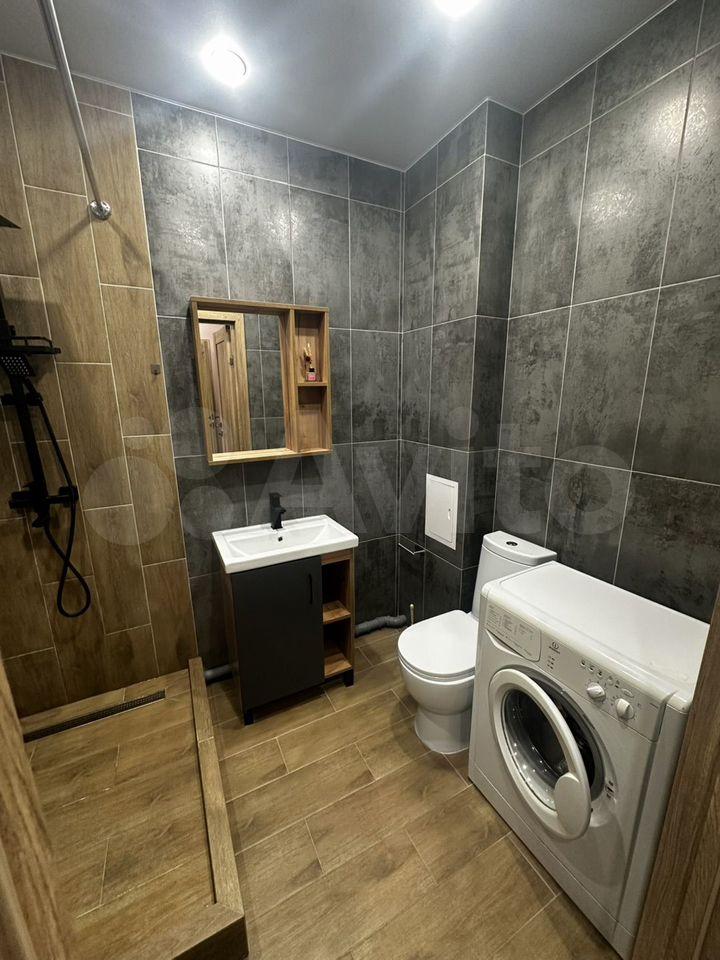 Кухня компактная, площадью 3 м², оснащена необходимой бытовой техникой, включая холодильник и микроволновую печь. Ванная комната совмещенная, оборудована современной сантехникой и стиральной машинкой.