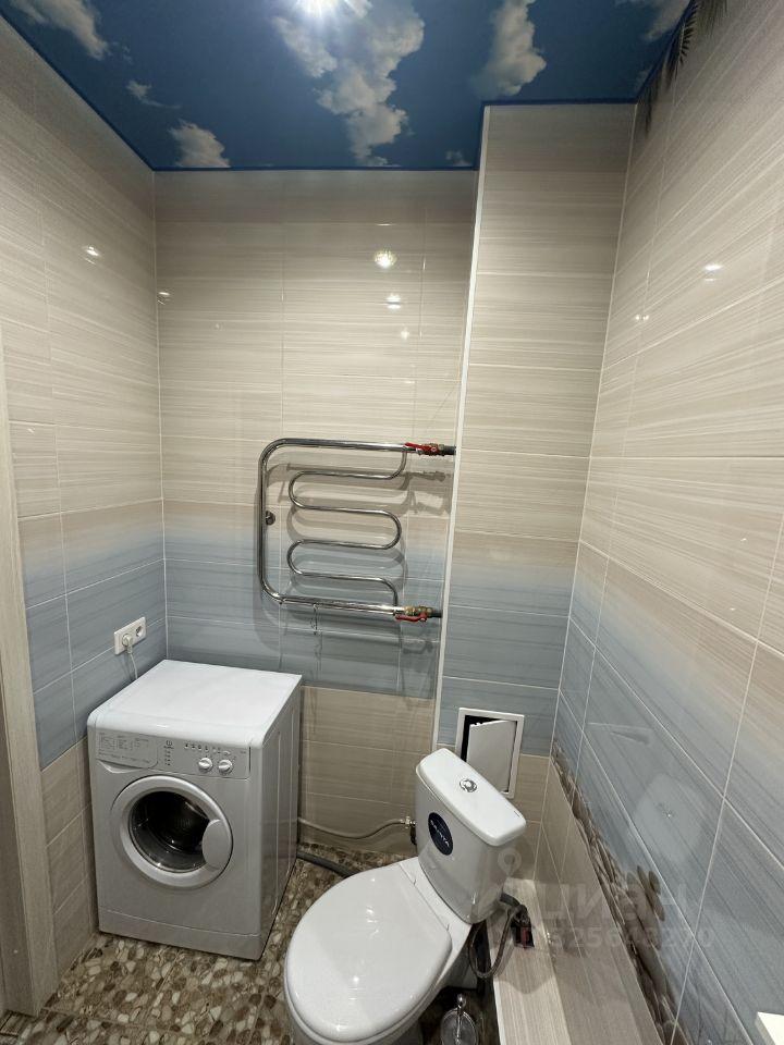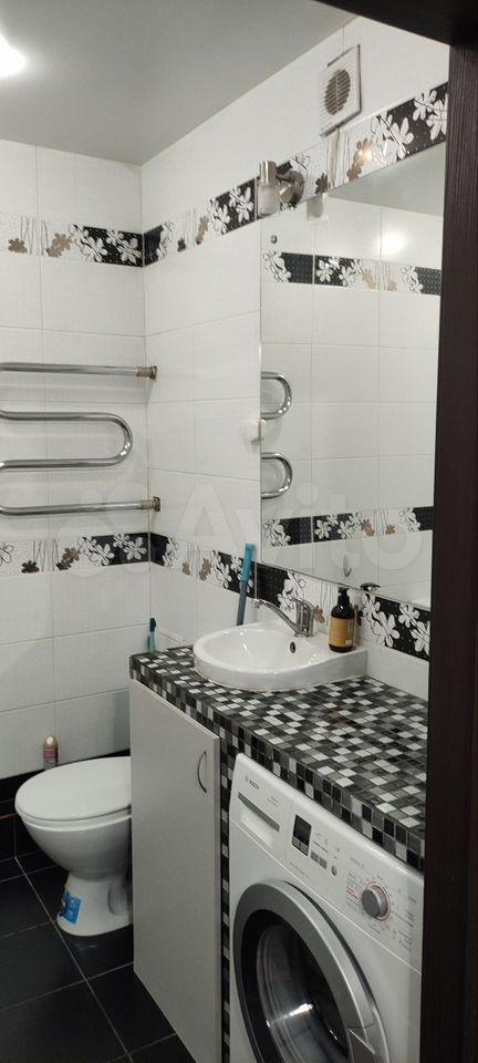 Кухня компактная, оснащена холодильником и плитой. Из мебели — вместительный шкаф и стол. Санузел совмещённый, оборудован стиральной машиной.